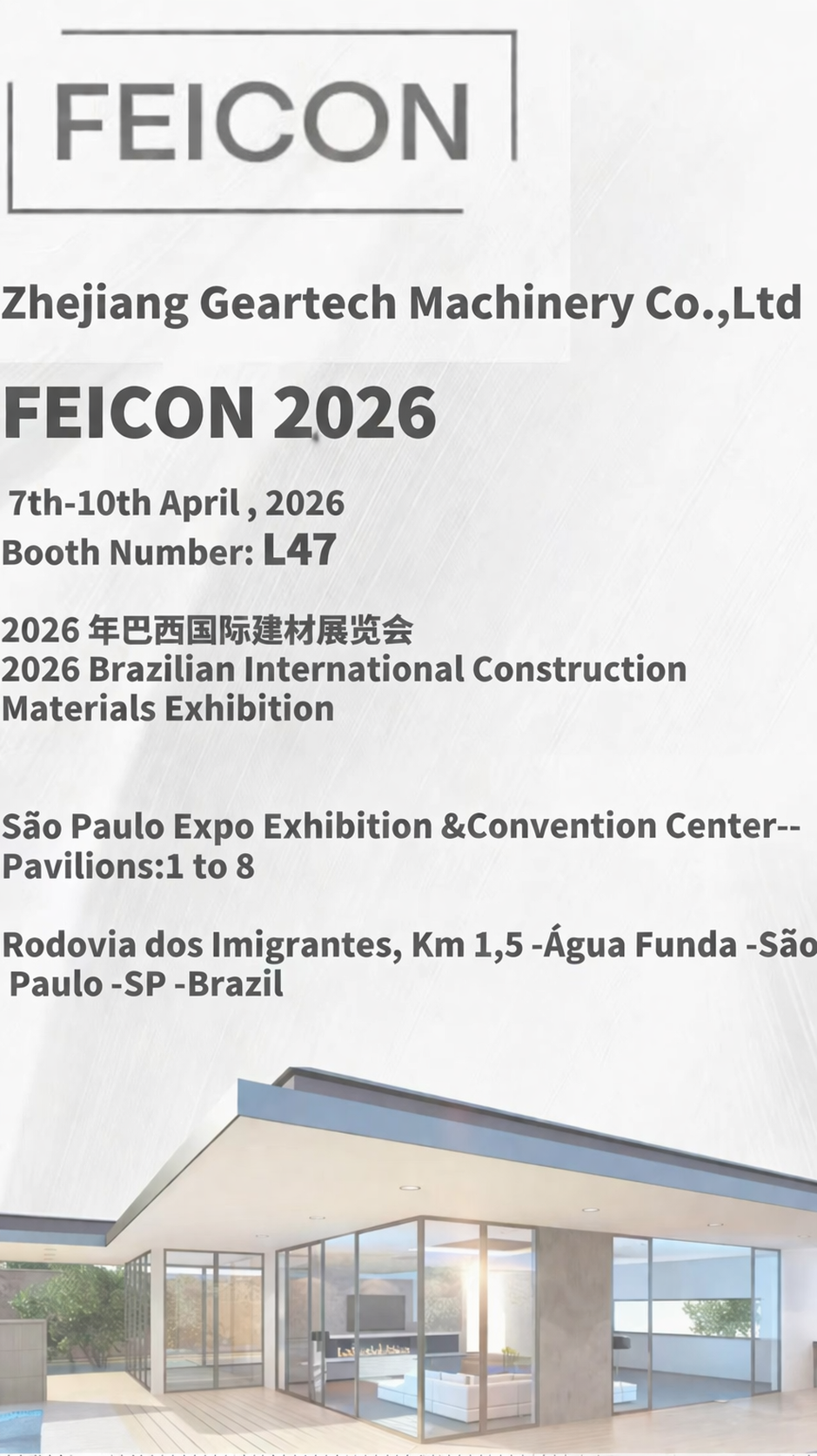 Zhejiang Geartech Machinery Co., Ltd. is pleased to announce our participation in the 2026 Brazilian International Construction Materials Exhibition, one of the key industry events in South America.
